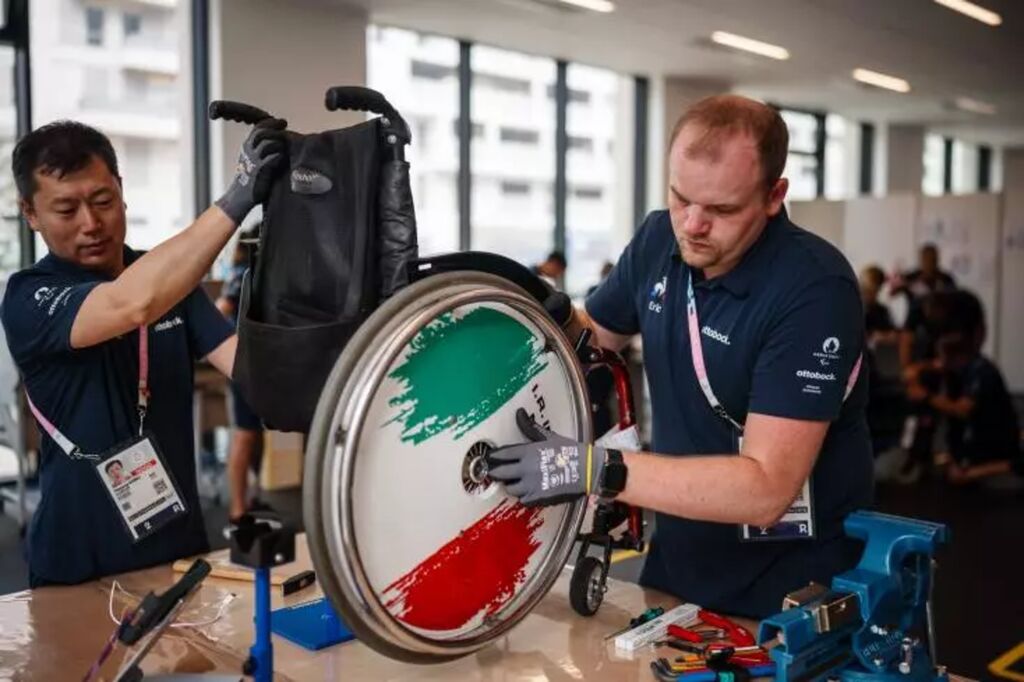 Deux fauteuils dépourvus de leurs roues trônent sur celui du fond. Ronny Heinze règle les freins sur le premier puis change un pneu endommagé : "ce sont des problèmes classiques, très fréquents", dit ce technicien allemand, qui a déjà travaillé à l'atelier de réparation lors de neuf éditions des Jeux paralympiques. Tournevis à la main, son collègue démonte la structure de l'autre fauteuil, propriété d'un pongiste, fendue sous l'assise, un problème moins commun.