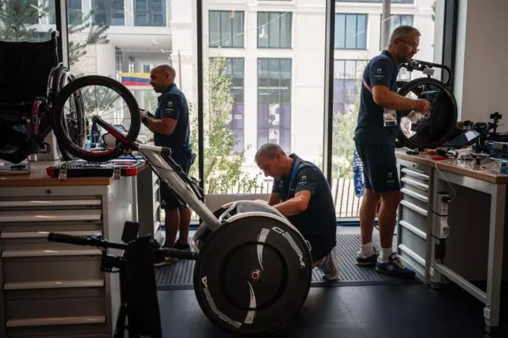 | Les techniciens s'affairent à remettre en état les fauteuils, dont ici un de course, au centre de réparation du Village paralympique. |