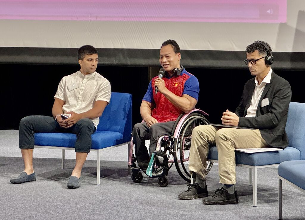 | L’haltérophile Lê Van Công (centre), champion paralympique en 2016, a partagé les moments forts de sa carrière et des recommandations inspirantes destinées aux jeunes Vietnamiens. |