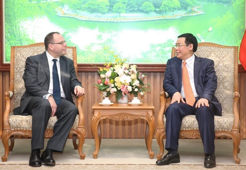 | Le vice-Premier ministre Vuong Dinh Huê (droite) et le directeur des relations gouvernementales et législatives, membre du Comité de direction du groupe Prudential, Julian Adams, le 5 mars à Hanoï. |