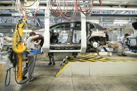 | Une chaîne d'assemblage à l'usine de PSA Peugeot Citroën, le 9 avril à Mulhouse. |