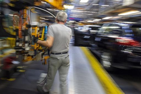 | Un employé travaille sur la chaîne de montage de la Peugeot 308 à l'usine de Sochaux, le 6 mars. |