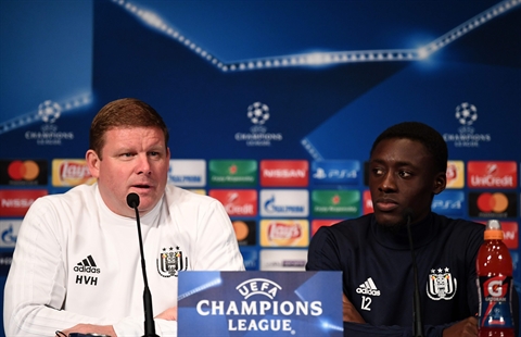 | L'entraîneur d'Anderlecht, Hein Vanhaezebrouck (gauche), et le défenseur Dennis Appiah, lors d'une conférence de presse, le 30 octobre à Paris. |