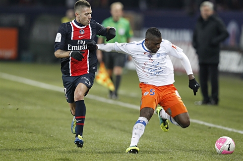 | Jeremy Menez (gauche) de PSG à la lutte contre Benimo N'Same de Montpellier, le 19 février au Parc des Princes. |