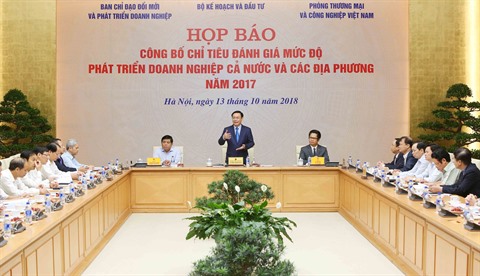 | Le vice-Premier ministre Vuong Dinh Huê (centre) dirige la conférence de presse sur la publication des indices de développement des entreprises de 2017, le 13 octobre à Hanoï. |