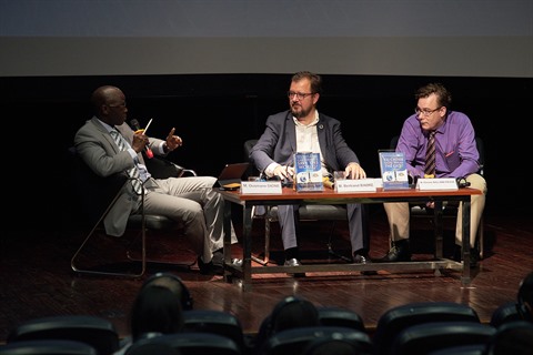 | De gauche à droite : Ousmane Dione, directeur national de la BM au Vietnam ; Bertrand Badré, ancien directeur général de la BM ; et Étienne Rolland-Piègue, directeur de l'Institut français du Vietnam, le 6 novembre à Hanoï. |