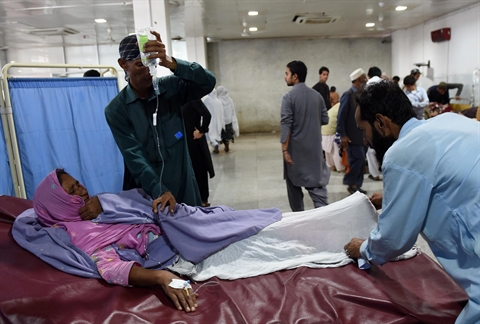 | Une personne blessée pendant le séisme, le 26 octobre à l'hôpital de Peshawar au Pakistan. |