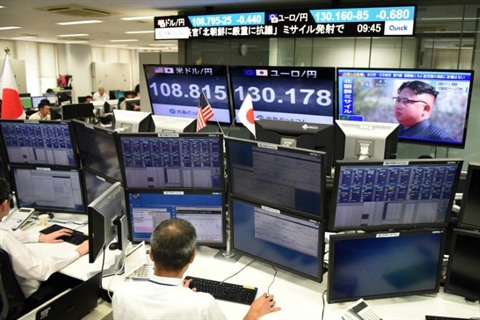 | Un écran de télévision montre le dirigeant nord-coréen Kim Jong-Un depuis une salle de courtage à Tokyo le 29 août. |
