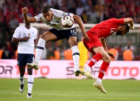 | Le Français Kylian Mbappé (c) lors de la défaite face à la Turquie 2-0 à Konya le 8 juin en qualifications de l'Euro-2020. |