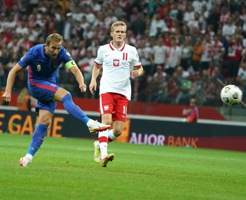 | L'attaquant anglais Harry Kane (gauche) ouvre le score face à la Pologne, lors des qualifications européennes pour le Mondial-2022, le 8 septembre à Varsovie. |