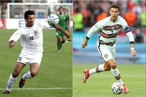 | L'Iranien Ali Daei (gauche) pendant un match contre l'Irak au stade Azadi de Téhéran, le 23 juin 2004, et l'attaquant portugais Cristiano Ronaldo contre Hongrie pendant l'Euro-2020, à la Puskas Arena de Budapest le 15 juin. |