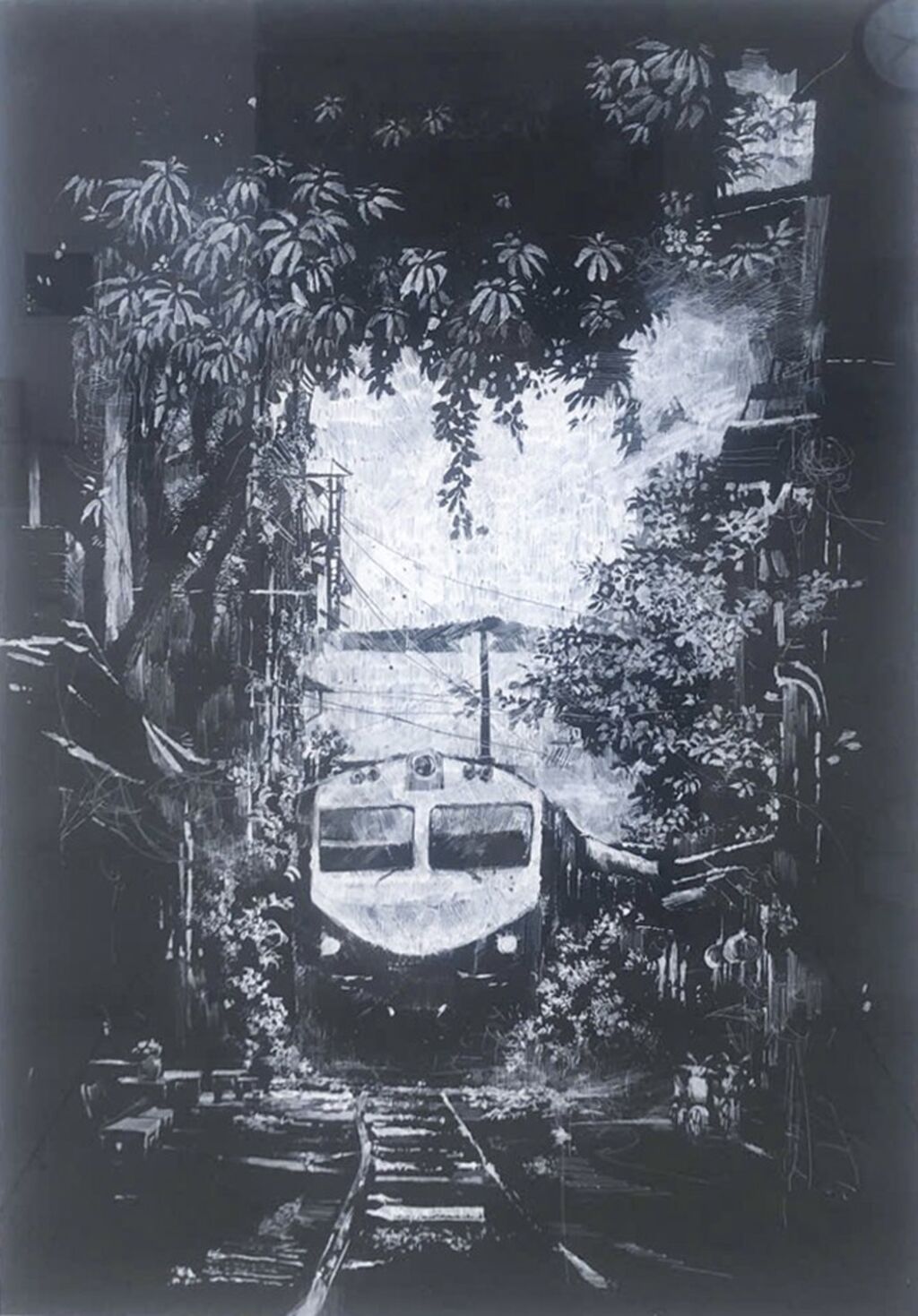 | "Hồi ức phố tàu" (Souvenirs de la rue des trains), dessin au trait sur papier du jeune peintre Nguyễn Đăng Hải Nam. |
