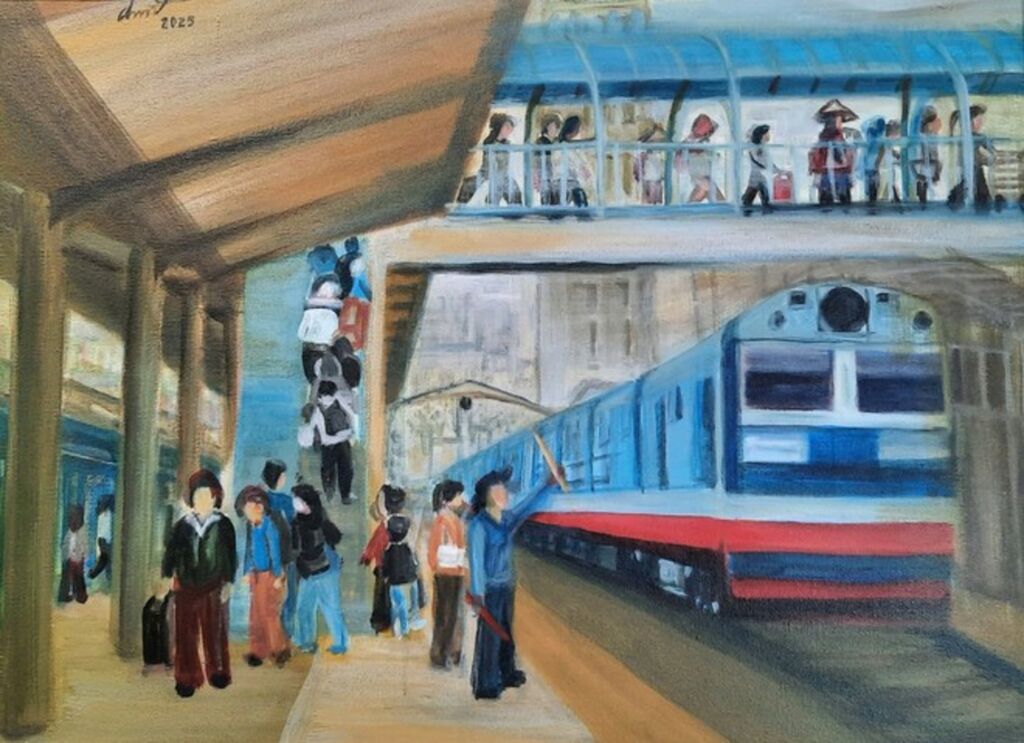 Vous y verrez des techniques familières - pastels, peinture à l’huile, acrylique, aquarelle, papier dó… - chacune avec sa propre profondeur. Certains choisissent des tons sombres pour peindre un vieux quartier traversé par les rails. D’autres préfèrent les matériaux modernes pour montrer le métro en chantier sous la ville. Et puis, il y a ces trains du futur qui roulent sous l’océan, entre rêve et réalité…