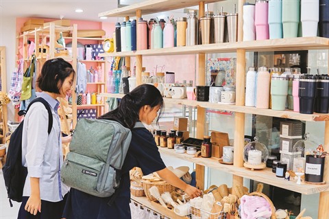 | Des jeunes achètent des produits écolos à la boutique A Little Leaf, à Hanoï. |