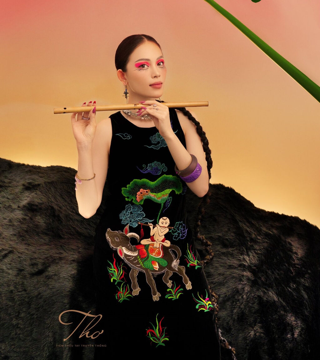 Pour ces dernières pièces, la styliste a fait preuve de discernement en sélectionnant avec soin les images à intégrer dans ses créations. Les thèmes des estampes de Đông Hô sont variés : des vœux de bonne chance, des activités quotidiennes et des allégories folkloriques. Et Tho Tho a choisi les peintures Hung dua (Cueillette des noix de coco), Muc đông thôi sáo (Jeune gardien de buffle jouant de la flûte) et Đám cuoi chuôt (Mariage des rats), qui font partie des plus célèbres de Đông Hô.