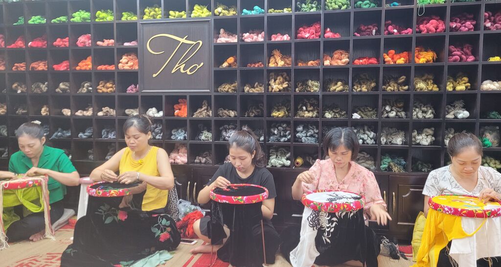 | Artisanes brodeuses travaillant dans la boutique Tiêm Tho. |