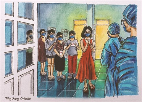 Ce sont la sincérité et le dévouement des médecins et des soldats qui ont inspiré ses illustrations. Dans le dessin représentant Huynh Duong, Tang Quang a mis en exergue les porte-clés que ce soldat a confectionnés lui-même pour les offrir aux confinés à leur sortie. Dans un autre, il a dépeint les fervents combattants qui viennent leur apporter du riz dans chaque chambre.