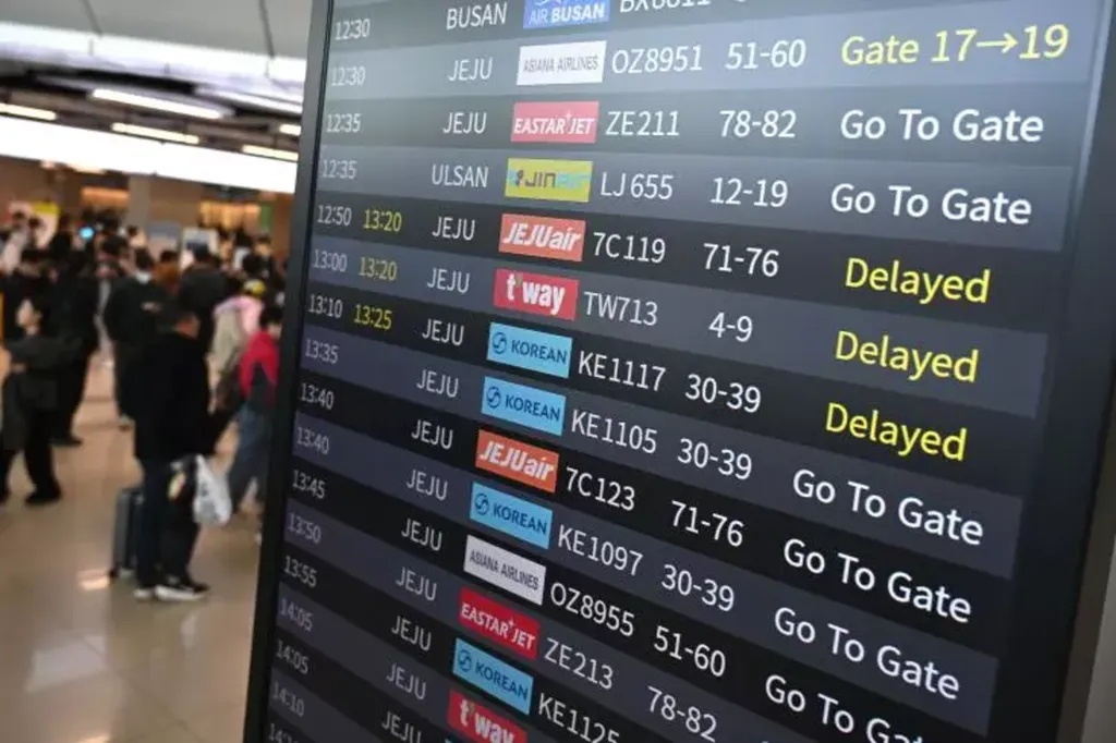 | Un panneau d'information dans l'aéroport Gimpo à Séoul le jour du baccalauréat en R. de Corée, le 13 novembre. |