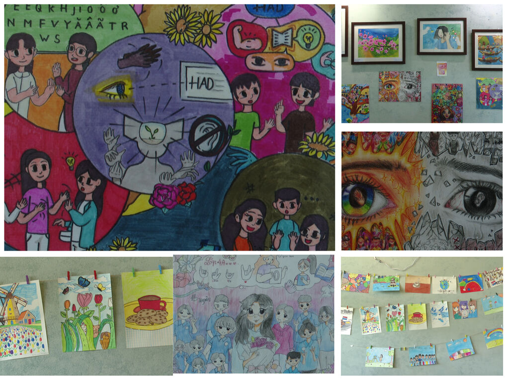 | Les œuvres réalisées par de jeunes artistes sourdes et malentendantes en exposition. |