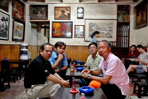 | Les murs du café Lâm (à Hanoi) sont garnis de peintures. |
