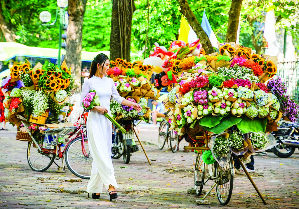 | Des vélos chargés de fleurs attendent les amateurs de photos le long de la rue Phan Dinh Phùng. |