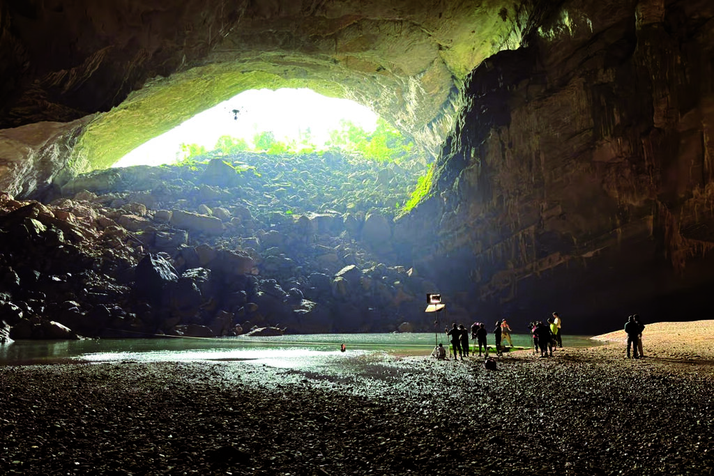 | L’équipe du film indien "Silaa" tourne des scènes dans la grotte de Hang Én, province de Quang Tri (Centre). |