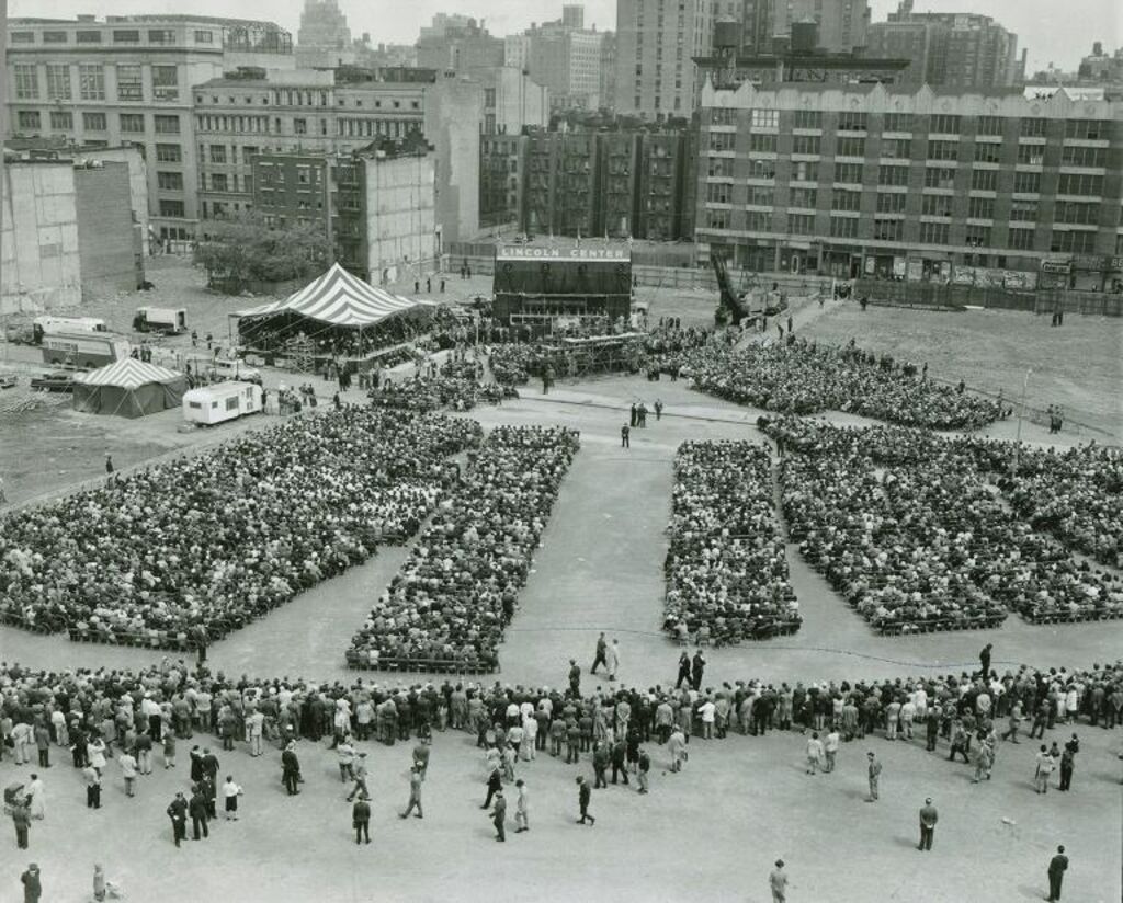 | Une cérémonie de pose de la première pierre a lieu au Lincoln Center de New York le 14 mai 1959, à l'endroit où le quartier de San Juan Hill a été déplacé pour faire place au complexe artistique. |
