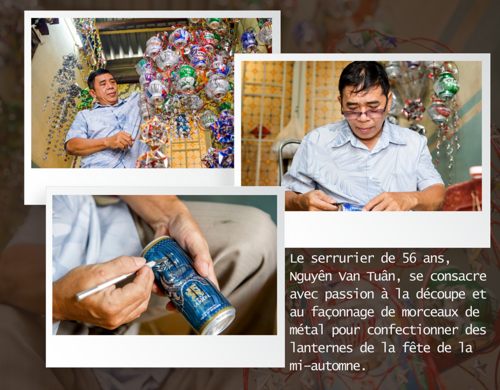 Avant la pandémie de COVID-19, ce serrurier exerçait son métier sur le trottoir de la rue Trân Quang Khai. Contraint au confinement durant la crise sanitaire, il s’est tourné vers les réseaux sociaux pour se distraire. Le hasard d’une vidéo montrant la fabrication artisanale de lanternes à partir de canettes a éveillé sa curiosité. Disposant de temps libre, il s’est lancé dans l’aventure.