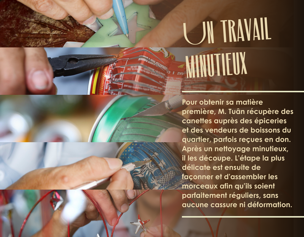 Dans son modeste atelier de moins de 4 m² du quartier de Tân Dinh, à Hô Chi Minh-Ville, un homme de 56 ans s’affaire, absorbé par la tâche de découper et de plier chaque fragment de métal froid. C’est ainsi que Nguyên Van Tuân donne naissance à une multitude de modèles, notamment des étoiles qui deviendront l’âme de ses lanternes.