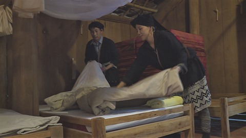| Bàng Thi Lan, de l’ethnie Dao, vit dans le district de Dà Bac, province de Hoà Binh, au Nord, prépare des lits pour accueillir les visiteurs logeant chez elle. |
