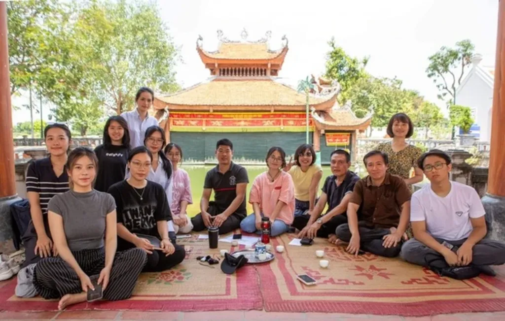 | Jeunes participant au projet "Dialogue avec la tradition", aux côtés d'artistes du village de marionnettes sur l'eau de Dào Thuc. |