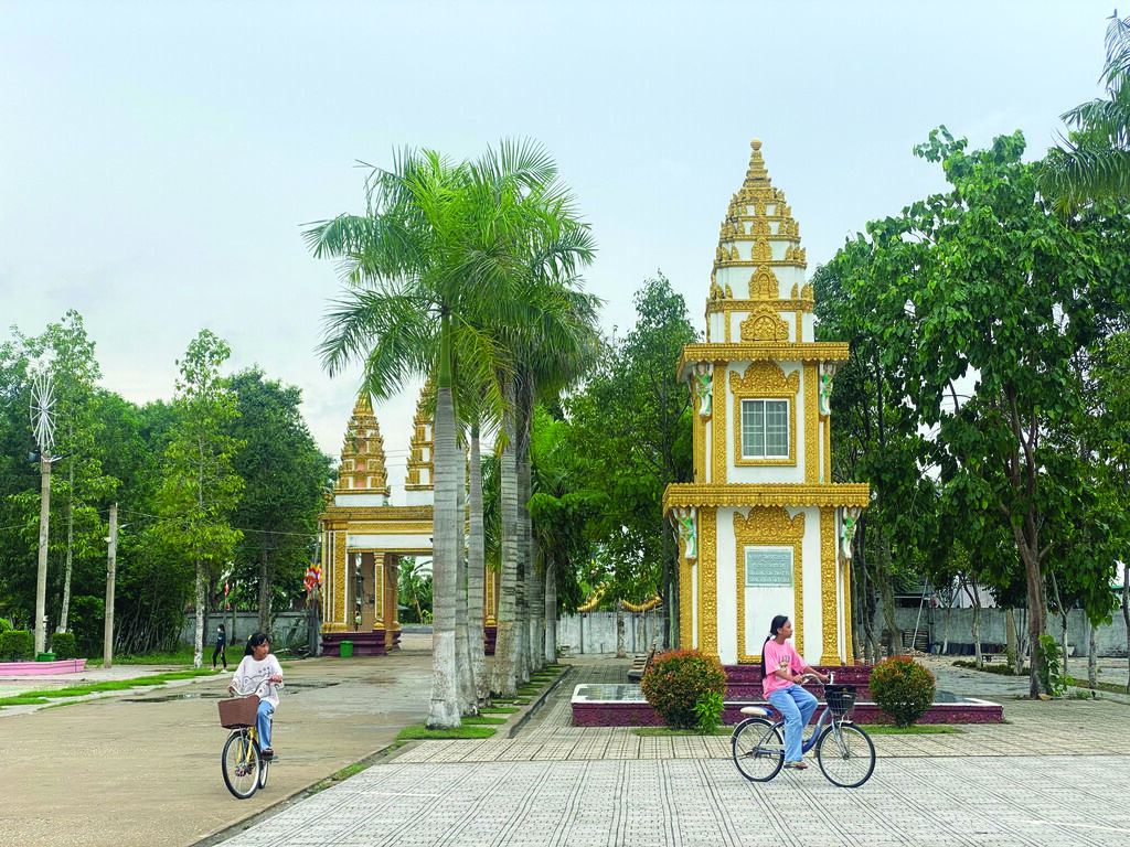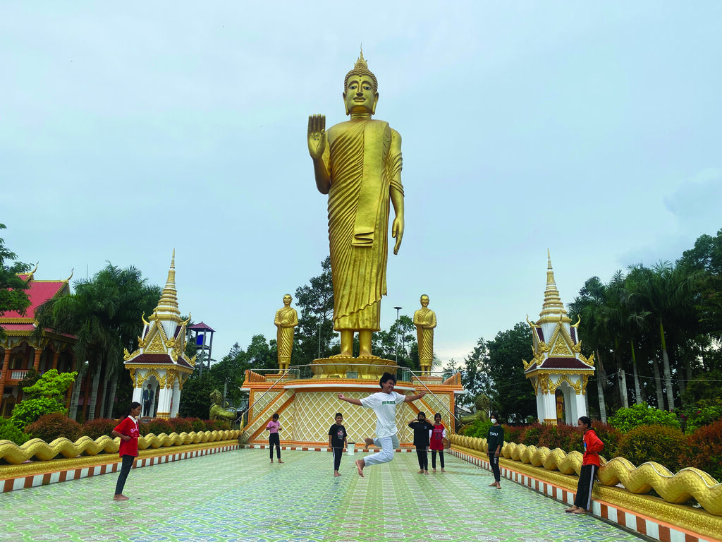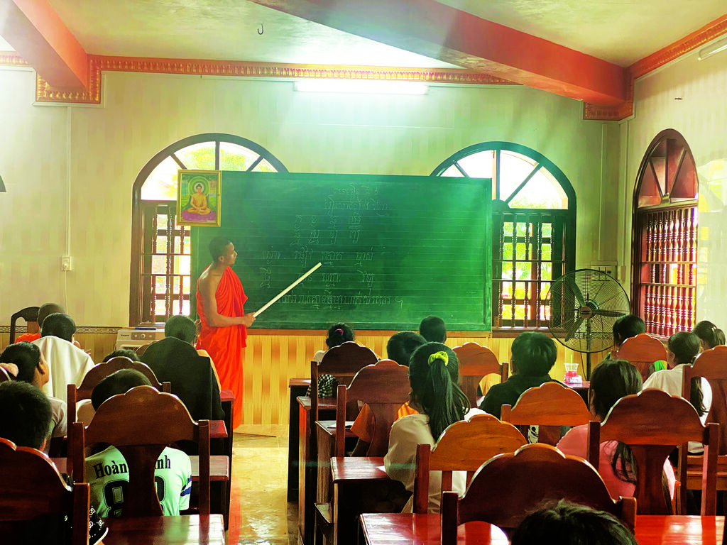 Nous arrivons à la pagode Sê Rây Ta Mon (ou Tà Mon) un jour de juin. Sous le doux soleil du matin, les enfants s’amusent en chahutant. Les uns sautent à la corde, les autres jouent à cache-cache. Dans l’édifice, les écoliers de 3e classe pratiquent la lecture à haute voix, créant une ambiance inhabituelle dans une pagode.