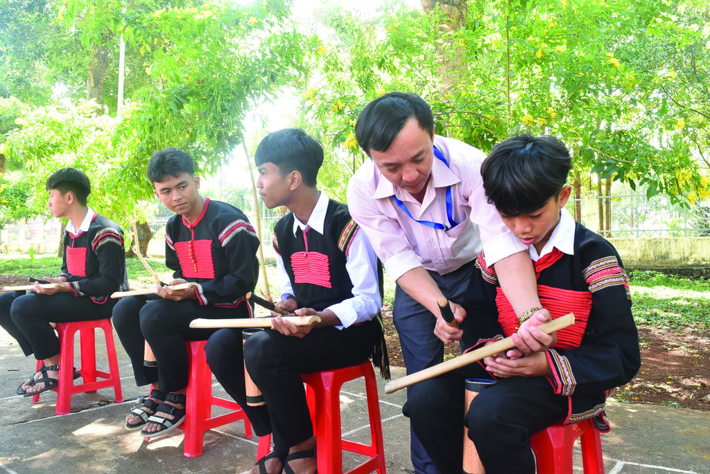 | L’enseignant Nguyên Phùng Quang Hiêu, chef de l’équipe des arts du spectacle du pensionnat ethnique du collège Cu M’gar (Dak Lak), enseigne aux élèves des instruments de musique ethniques. |