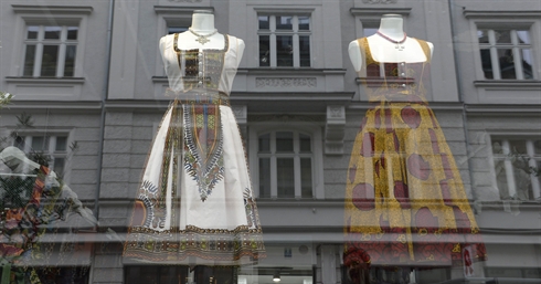 | Une vitrine de la boutique des créatrices Rahmee Wetterich et Marie Darouiche présentant des "Dirndl à l'africaine". |