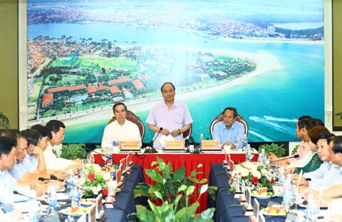 | Le Premier ministre Nguyên Xuân Phuc (debout) prend la parole lors d'une séance de travail avec le Comité provincial du Parti pour Quang Binh (Centre), tenue le 26 août. |