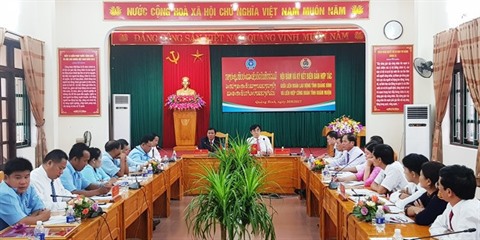 | Séance de travail entre la Fédération de travail de la province de Quang Binh et la délégation de l’Union des syndicats de la province de Kham Muôn (Laos), le 20 juin à Quang Binh. |