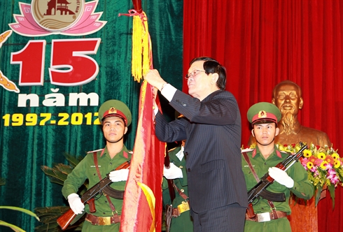 | Le président Truong Tân Sang décore l'Ordre Hô Chi Minh à la province de Quang Nam, lors de la cérémonie du 15e anniversaire de son rétablissement, le 7 février. |