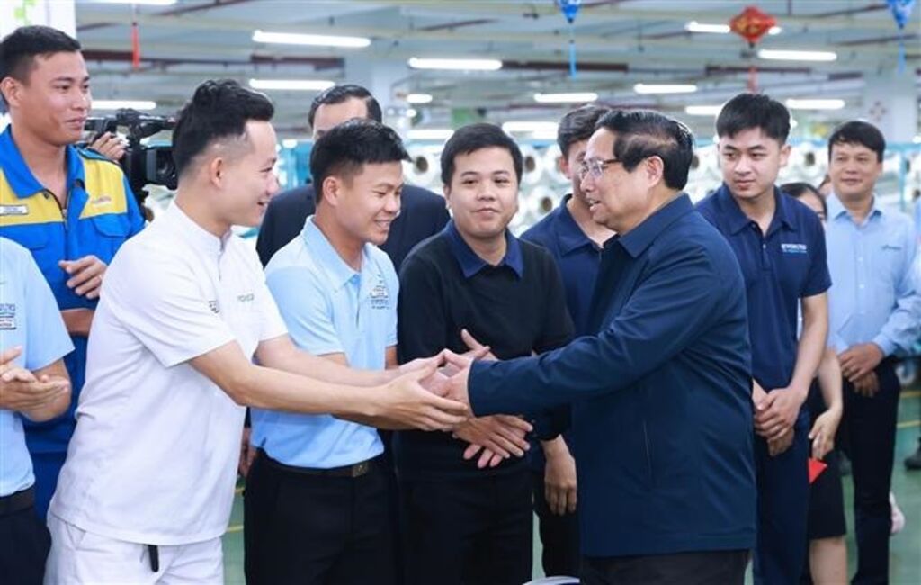 | Le Premier ministre Pham Minh Chinh rencontre de jeunes ouvriers du groupe HS Hyosung à Quang Nam. |