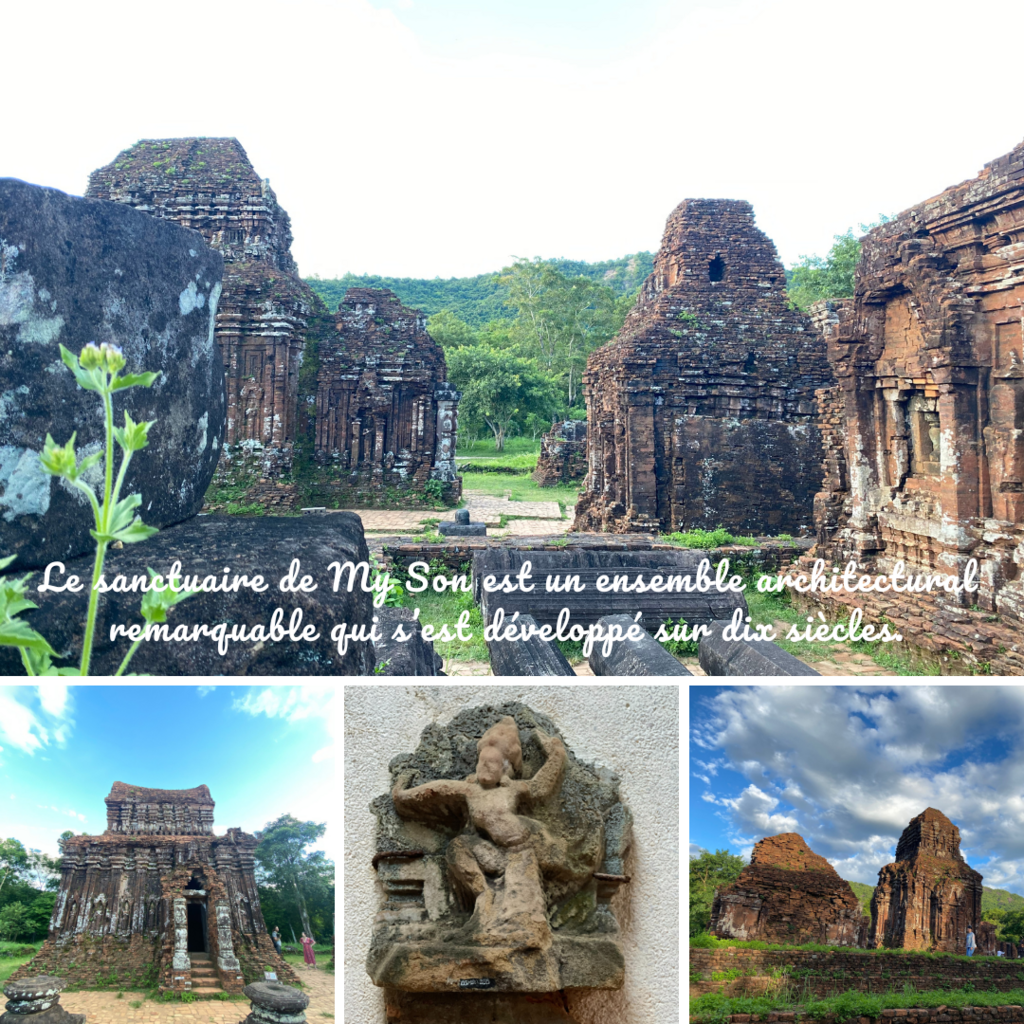 Le sanctuaire de My Son, constitué de plusieurs temples et sculptures sacrées dédiées à Shiva, était la capitale religieuse et politique du Royaume du Champa. L’une de ses caractéristiques les plus frappantes est son architecture unique. Les temples et les tours sont construits en briques rouges, finement sculptées et assemblées avec une précision étonnante. Les détails des motifs et des sculptures sont magnifiques, témoignant du savoir-faire artistique des anciens Cham.
