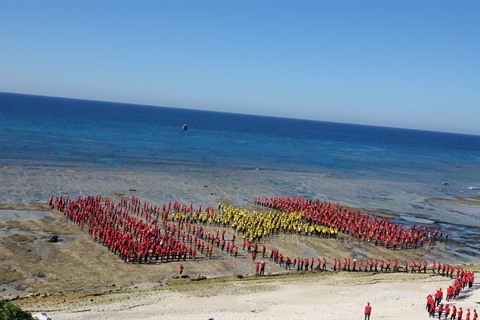 | Une foule de 3.000 personnes a chanté l'hymne national et formé un drapeau national de 45 m x 25 m. |
