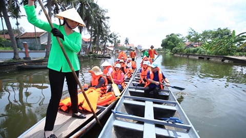 | Les touristes peuvent faire de la rame le long de la rivière Cua Dinh devant la maison commune de Phong Côc. |