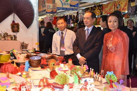 | L’ambassadeur du Vietnam en France, Nguyên Ngoc Son (centre), visite un stand vietnamien à la Foire de Paris 2015. |