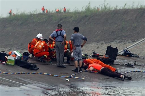 | Des secouristes chinois sur le lieux du naufrage du Dongfangzhixing sur le Yangtsé le 2 juin. |