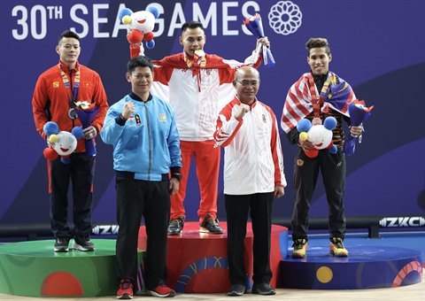 | L'haltérophile Thach Kim Tuân (gauche) a rapporté, le 2 décembre, une médaille d'argent en soulevant un total de 304 kg. |
