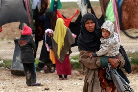 | Une femme syrienne porte son enfant dans le camp de déplacés d'Al-Hol, dans le Nord-Est syrien, le 8 décembre. |