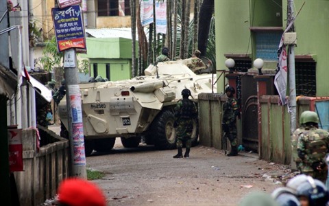 | Des militaires bangladais près d'un véhicule blindé lors d'une opération contre des "extrémistes islamistes" retranchés dans un immeuble, le 25 mars à Sylhet (Nord-Est). |