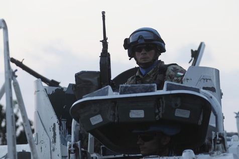 | Un soldat des Nations unies dans le Sud du Liban, à proximité de l'endroit d'où les roquettes tombées sur Israël ont été tirées. |