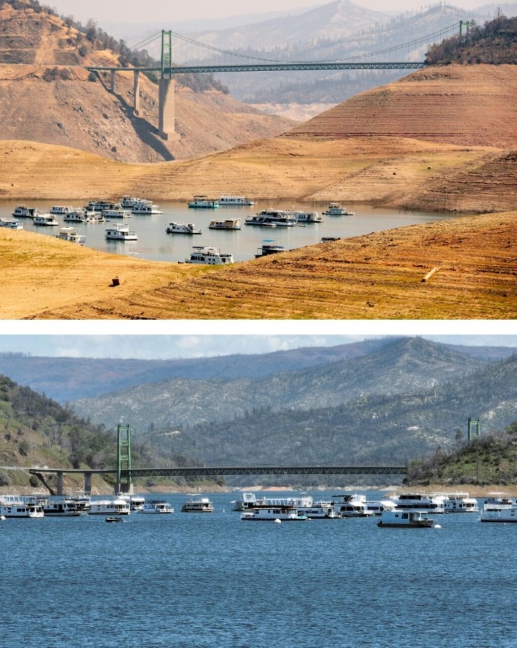 | Le lac Oroville, en Californie, le 5 septembre 2021 (en haut) et le 16 avril 2023 (en bas). Photo : AFP/VNA/CVN |