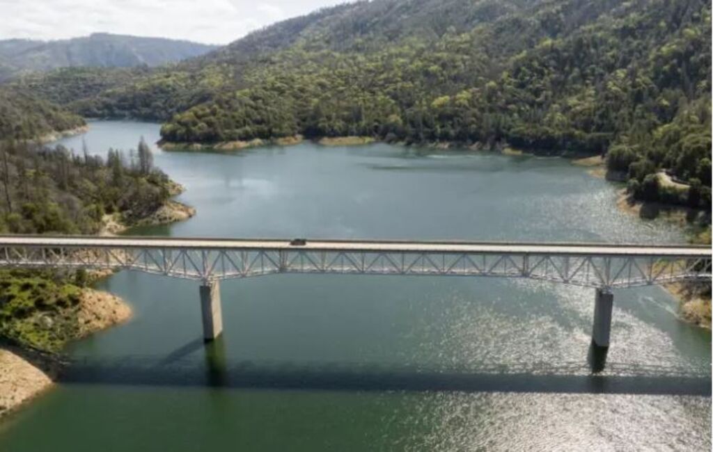 Le pont Enterprise voit désormais le lac Oroville passer de part et d'autre de ses piliers quand auparavant la poussière dominait ses alentours.
