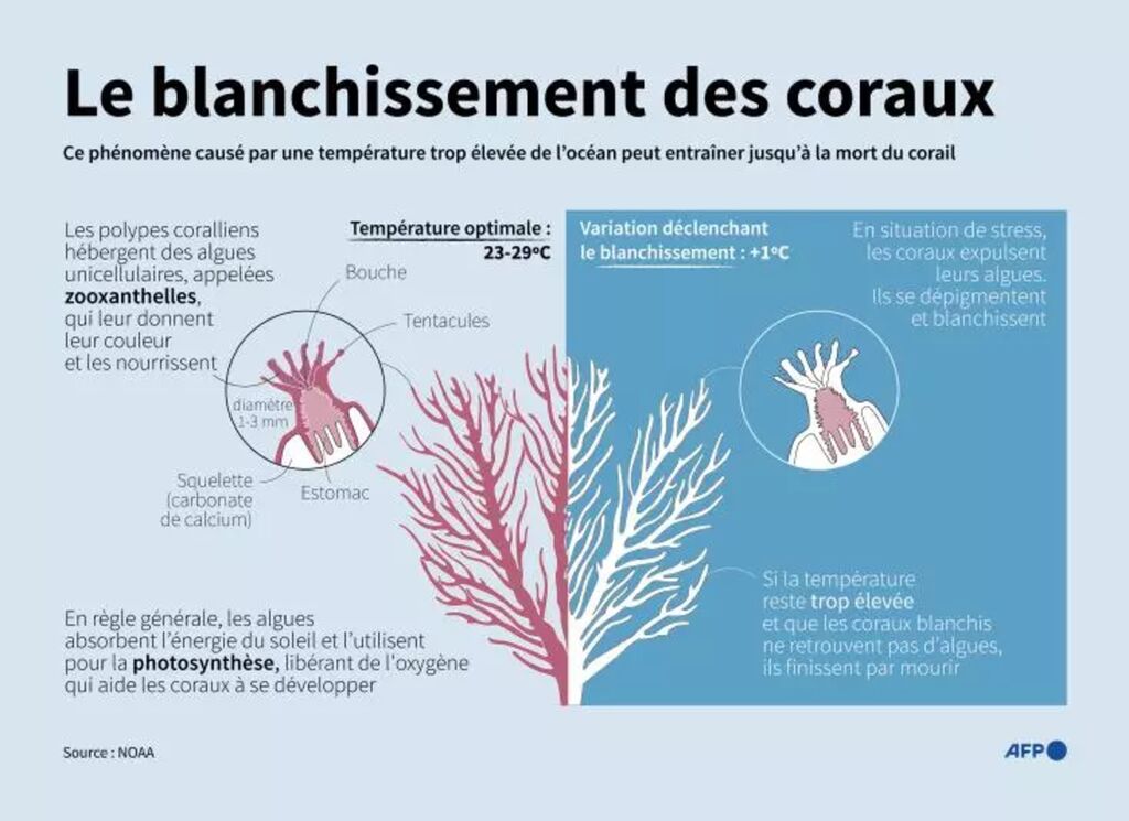 | Explication du phénomène de blanchissement des coraux pouvant se produire lorsque la température de l'océan est plus élevée que la normale. |